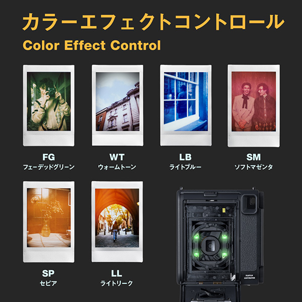 カメラ内部にLEDを搭載し、ダイヤルの設定値に応じて異なる色の光をフィルムに直接照射することで6種類の色表現ができる「カラーエフェクトコントロール」や、周辺光量を抑え中心部をフォーカスする「ビネットモード」など、アナログ技術でプリント表現の幅をさらに広げる新機能を搭載。撮影時の明るさなど撮影環境によって、プリントに現れる「カラーエフェクトコントロール」「ビネットモード」の効果も異なるため、味わい深い多彩な写真をお楽しみいただけます。