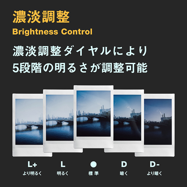 カメラ側面の「濃淡調整ダイヤル」を使用し、ハイキーやローキーの写真を楽しめます。「D-」から「L+」までの5段階で調整可能で、「カラーエフェクトコントロール」や「ビネットモード」との掛け合わせにより、色合いと明るさを自由自在に操り撮影できます。