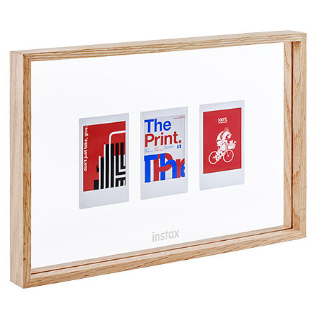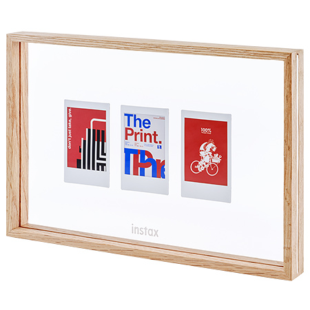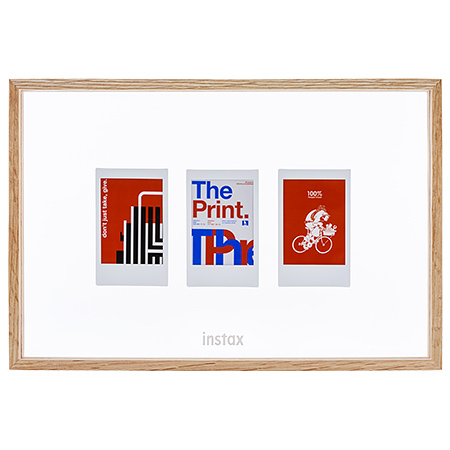 自然な風合いが美しいオーク材を使用したチェキフィルム専用フォトフレームです。 3枚分のプリントを理想的に配置できる目印があらかじめ付いており、初めての方でもバランスよく飾ることができます。 縦置き・横置きの両方に対応し、さらに壁掛け用の金具も備えているため、置く場所を選ばず多彩なディスプレイスタイルを楽しんでいただけます。 シンプルで飽きのこないデザインは、カジュアルな空間からナチュラルテイストのインテリアまで、幅広く調和します。ロゴが程よいアクセントとなっているのもポイントです。